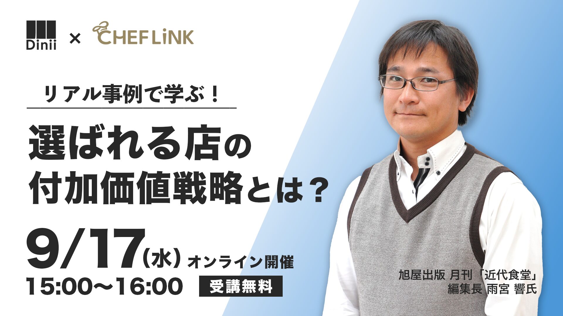 株式会社シェアダイン(本社:東京都港区/代表取締役 飯田陽狩)と株式会社ダイニー(本社:東京都千代田区/代表取締役 山田真央)は、『近代食堂』編集長である雨宮響氏を登壇者として迎え、2025年9月17日(水)15:00より「選ばれる飲食店の付加価値戦略」をテーマに無料オンラインセミナーを共催いたします。