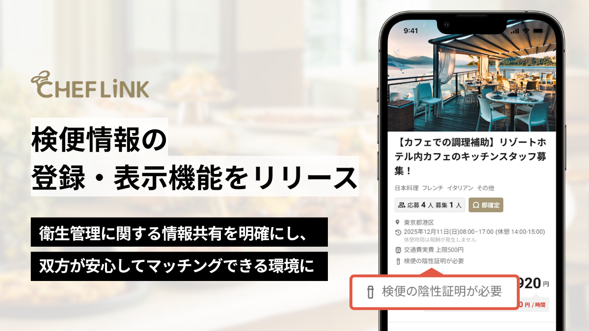 これにより、応募時点で検便要件と検査状況が明確となり、マッチング後の確認作業を軽減。事業者・シェフ双方が衛生面で安心してやり取りできる環境を実現します。