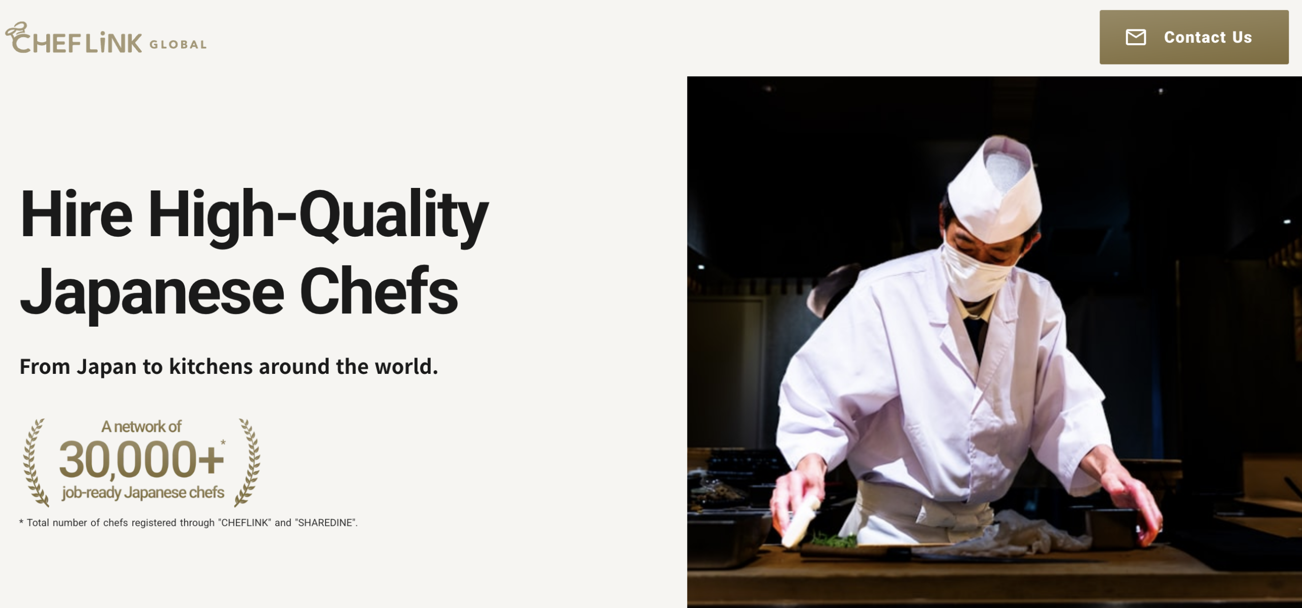 「CHEFLINK GLOBAL」は、国内飲食事業者が海外拠点を新規出店・拡大する際に必要となる調理人材の採用を支援するサービスです。